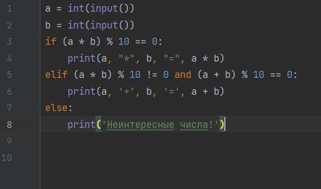 elif (a * b) % 10 != 0 and (a + b) % 10 == 0: