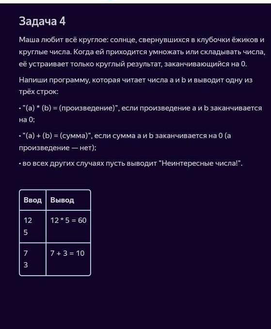 Маша любит всё круглое: солнце, свернувшихся в клубочки ёжиков и круглые числа. Когда ей приходится умножать или складывать числа, её устраивает только круглый результат, заканчивающийся на 0.