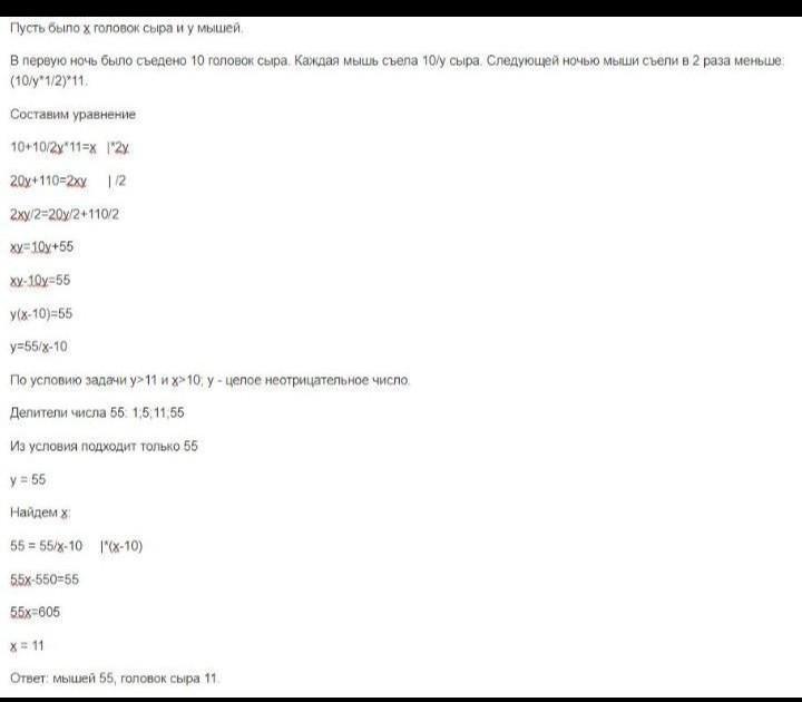 В погребе хранилось несколько головок сыра. Ночью пришли мышки и съели 10 головок сыра, причём все съели поровну. Следующей ночью пришли не все мышки, а только 11, и доели оставшийся сыр, но каждая мышка съела в два раза меньше сыра, чем накануне. Сколько головок сыра хранилось в погребе? СРОЧНО!!!