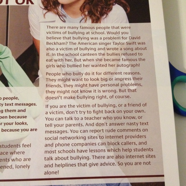Существует много знаменитостей, над которыми издевались в школе. Поверишь ли ты, в то что унижения были проблемой для Дэвида Бэкхема? Американская певица Тэйлор Свифт была также подавленой издевательствами и даже написала песню об этом. В школьной столовой хулиганы отказывались кушать рядом с ней. Но когда она стала знаменитой, девочки, которые подавляли ее, захотели взять у нее автограф!