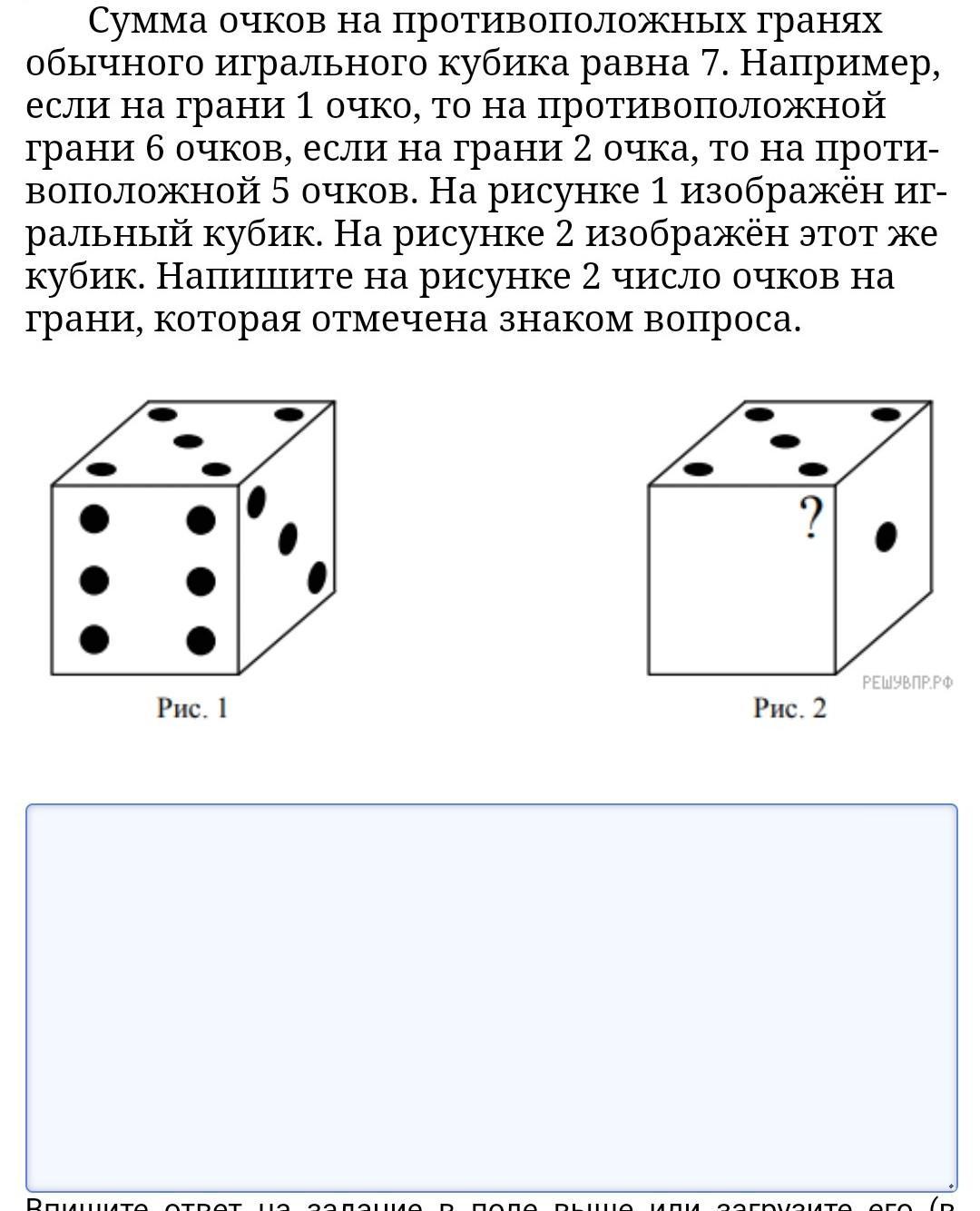 Сумма очков на противоположных гранях обычного игрального кубика равна 7. Например, если на грани 1 очко, то на противоположной грани 6 очков, если на грани 2 очка, то на противоположной 5 очков. На рисунке 1 изображён игральный кубик. На рисунке 2 изображён этот же кубик. Напишите на рисунке 2 число очков на грани, которая отмечена знаком вопроса.