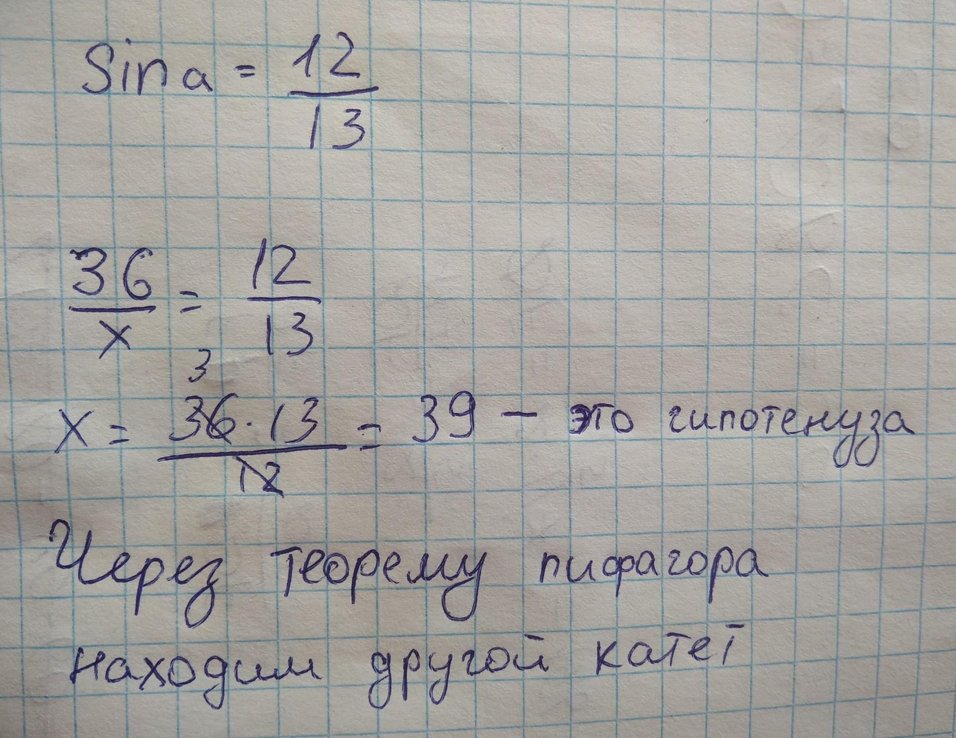 катет прямоугольного треугольника 36 см, а синиус противоположного угла 12/13.найдите другие стороны треугольника.