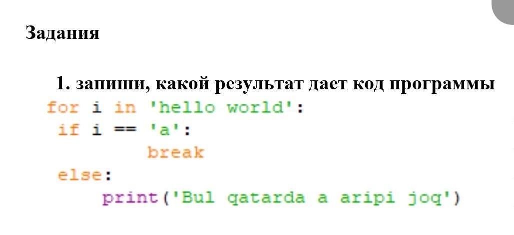 1. запиши, какой результат дает код программы for i in 'hello world': if i == 'a':