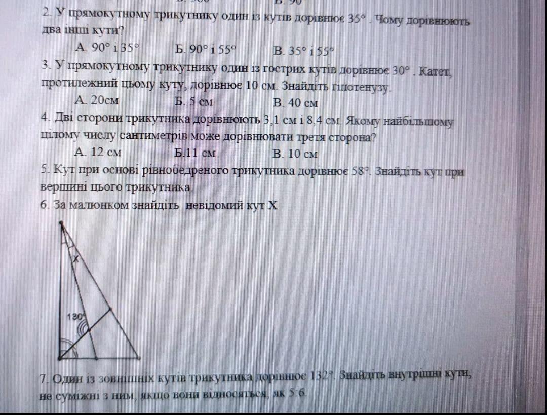 левый нижний угол - прямой - 90 градусов, бисектриса делит его на две части, 45 и 45. Сумма кутов треугольника - 190 градусов, 130 + 45 = 175. 190 - 175 - 15. те два углы равны