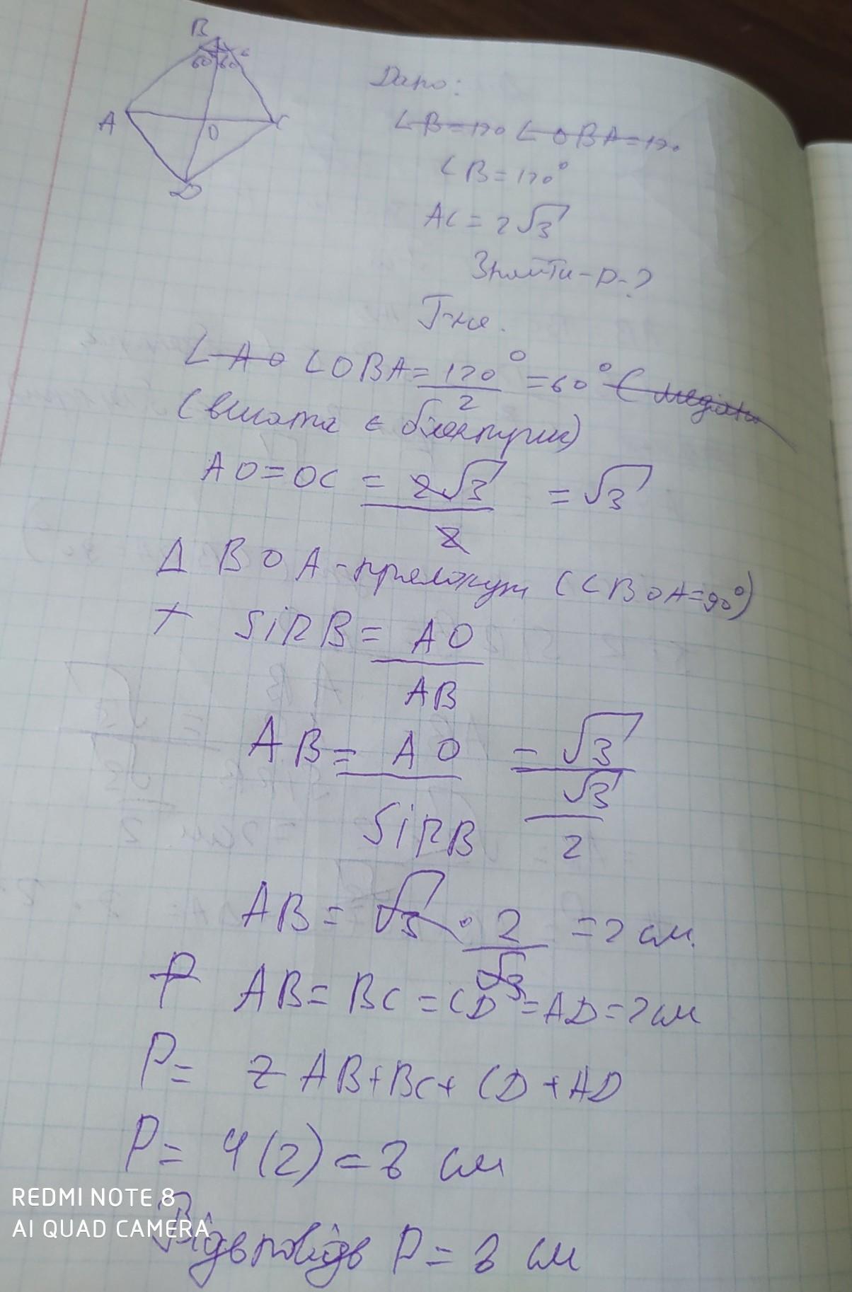 Градусна міра одного з кутів ромба дорівнює 120, а діагональ, що проведена з вершини іншого кута, дорівнює 2√3. Знайдіть периметр ромба.