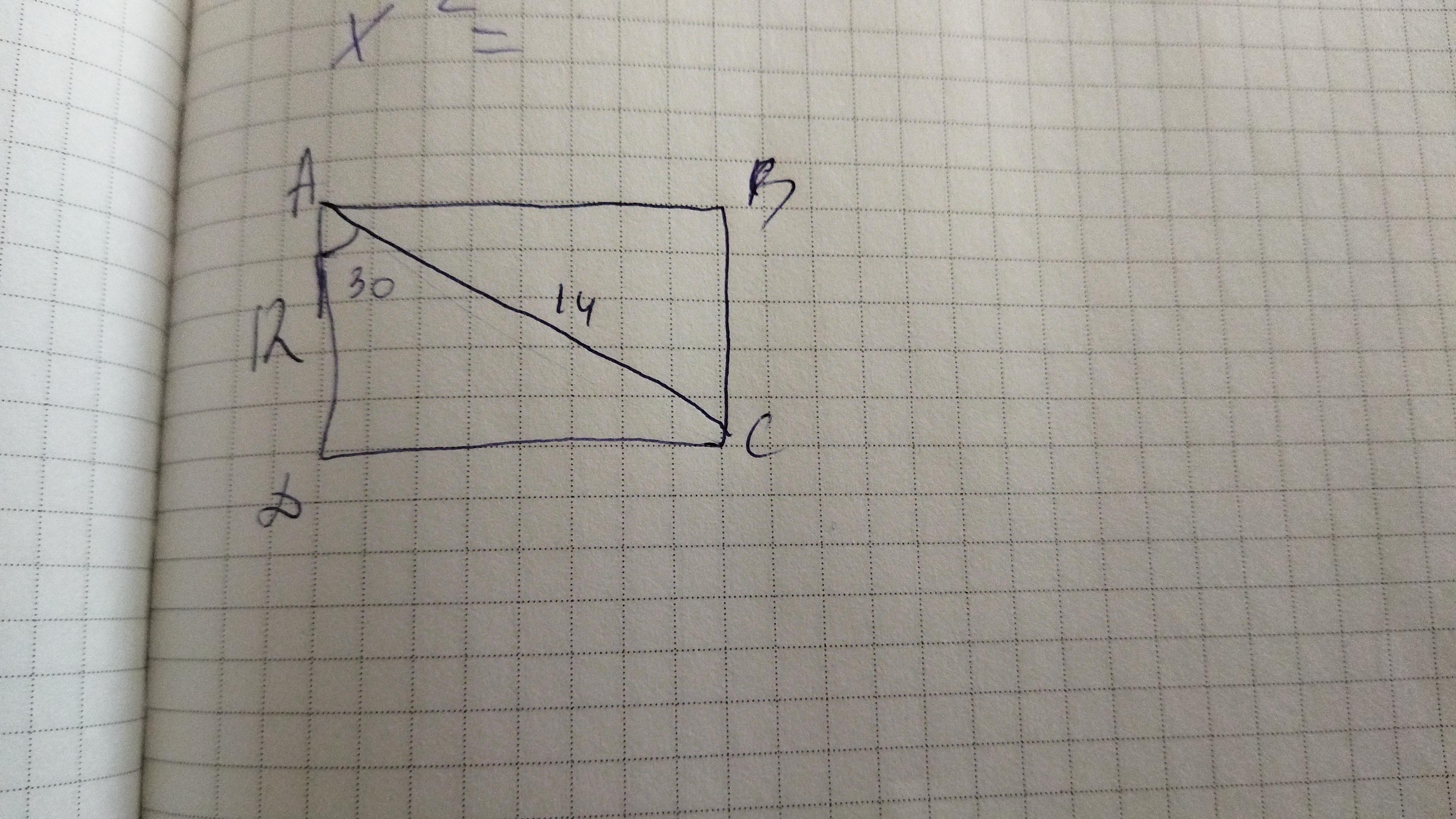 Найти площадь прямоугольника АВСД, если угол САД равен 30, AC=14см, АД=12см