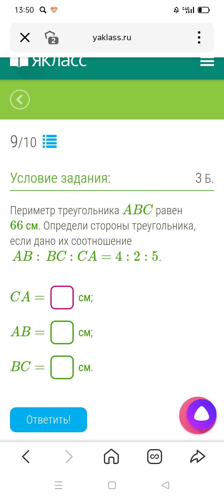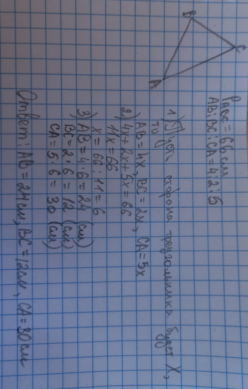нужно ввести коэффициент х, тогда 4х 5х 2х стороны треугольника, периметр сумма длин всех сторон, тогда 5х+2х+4х=66