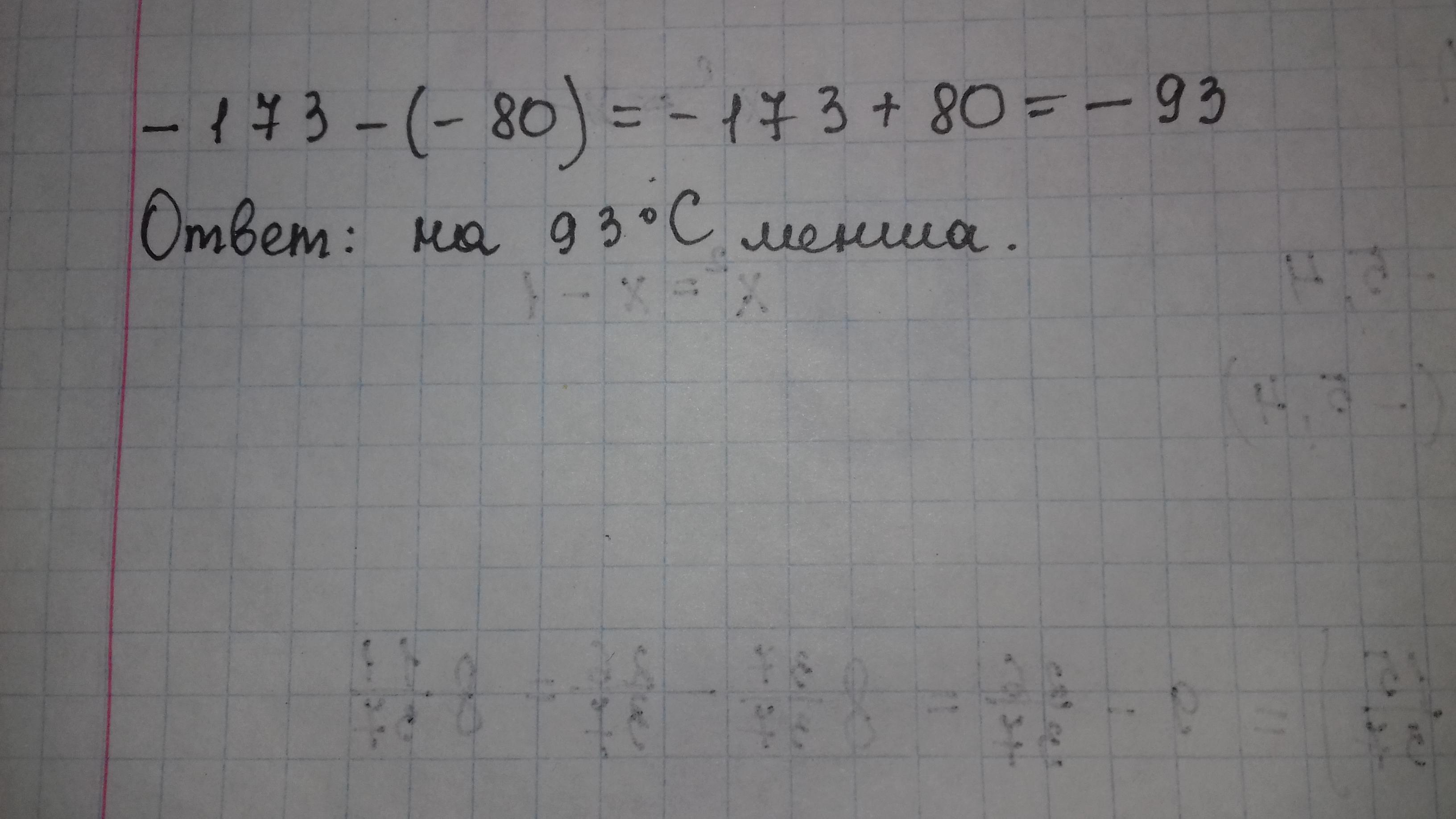 Температура за бортом літака на значній висоті дорівнює -80С, а найнижчою температурою в природі вважають -173С. На скільки найнижча температура в природі менша за вказану температуру за бортом літака?