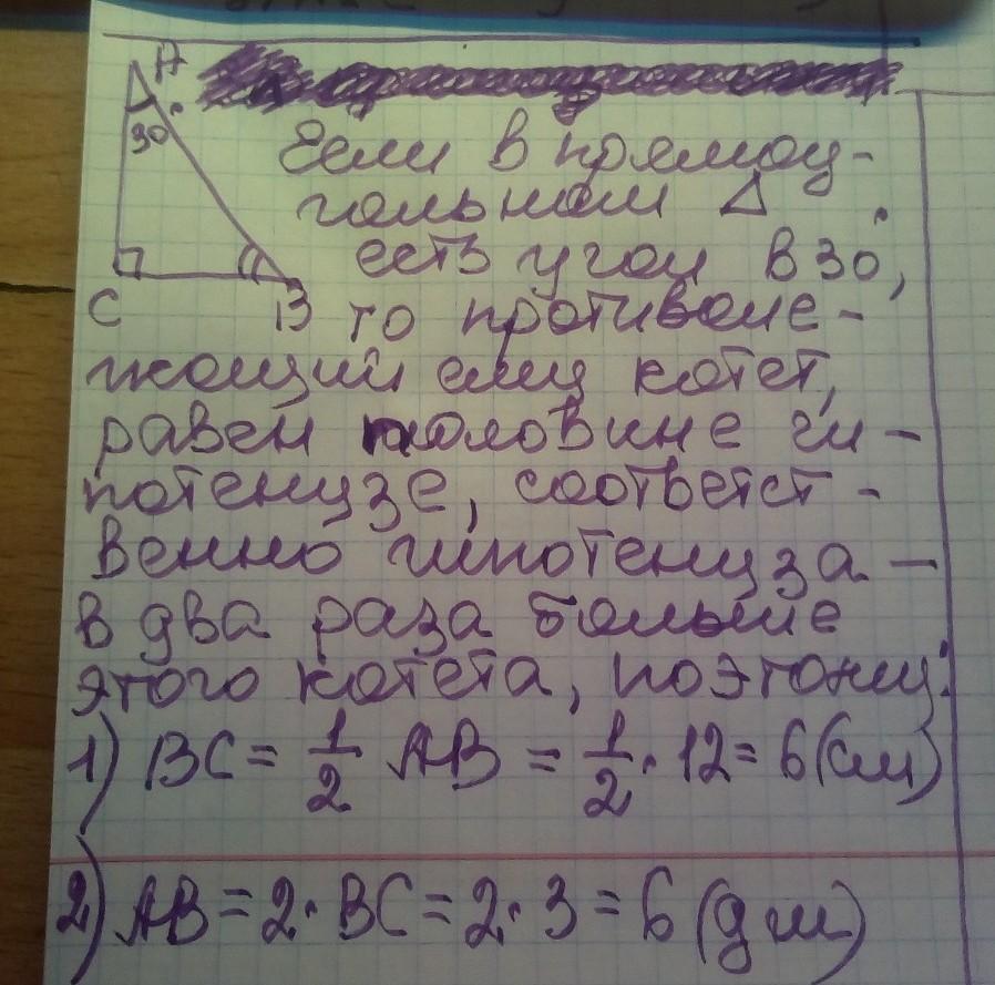 ДАМ 100 БАЛОВ у прямокутному трикутнику АВС ([С=90°) ( А=30°) знайдіть : ВС,якщо АВ=12 см 2) АВ,якщо ВС=3 дм