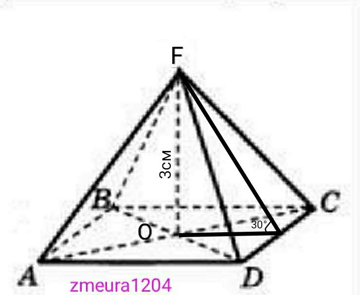 висота правильної чотирикутної піраміди дорівнює 3 см. Бічна грань утворює кут 30 градусів із площиною основи .знайти обєм піраміди .