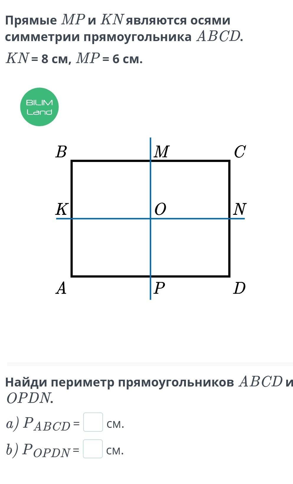 Урок 4 Прямые MP и KN являются осями симметрии прямоугольника ABCD. KN = 8 см, MP = 6 см. Найди периметр прямоугольников ABCD и OPDN. a) PABCD =см. b) POPDN =см. Назад Проверить