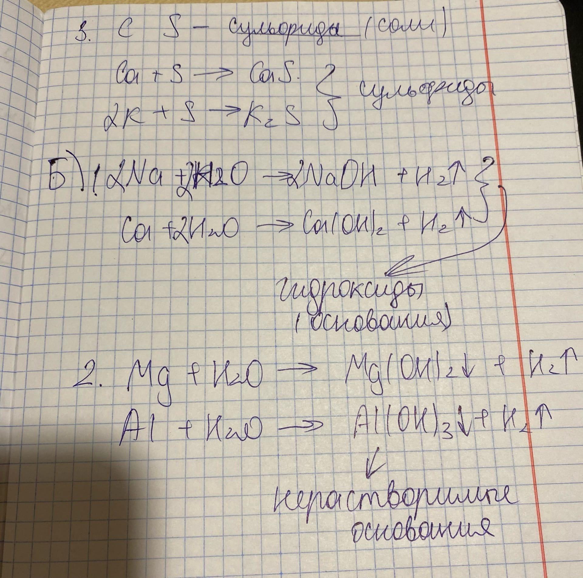 3. С серой (S).Как называются продукты реакции? К какому классу веществ относятся продукты реакции? Записать уравнения реакций взаимодействия калия, кальция с серой.