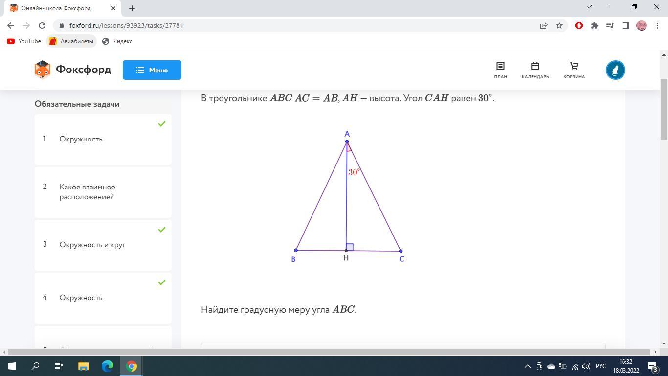 угол ВAС = 30 * 2 = 60 (градусов) => угол ABC = (180 - 60) / 2 = 60 гр.