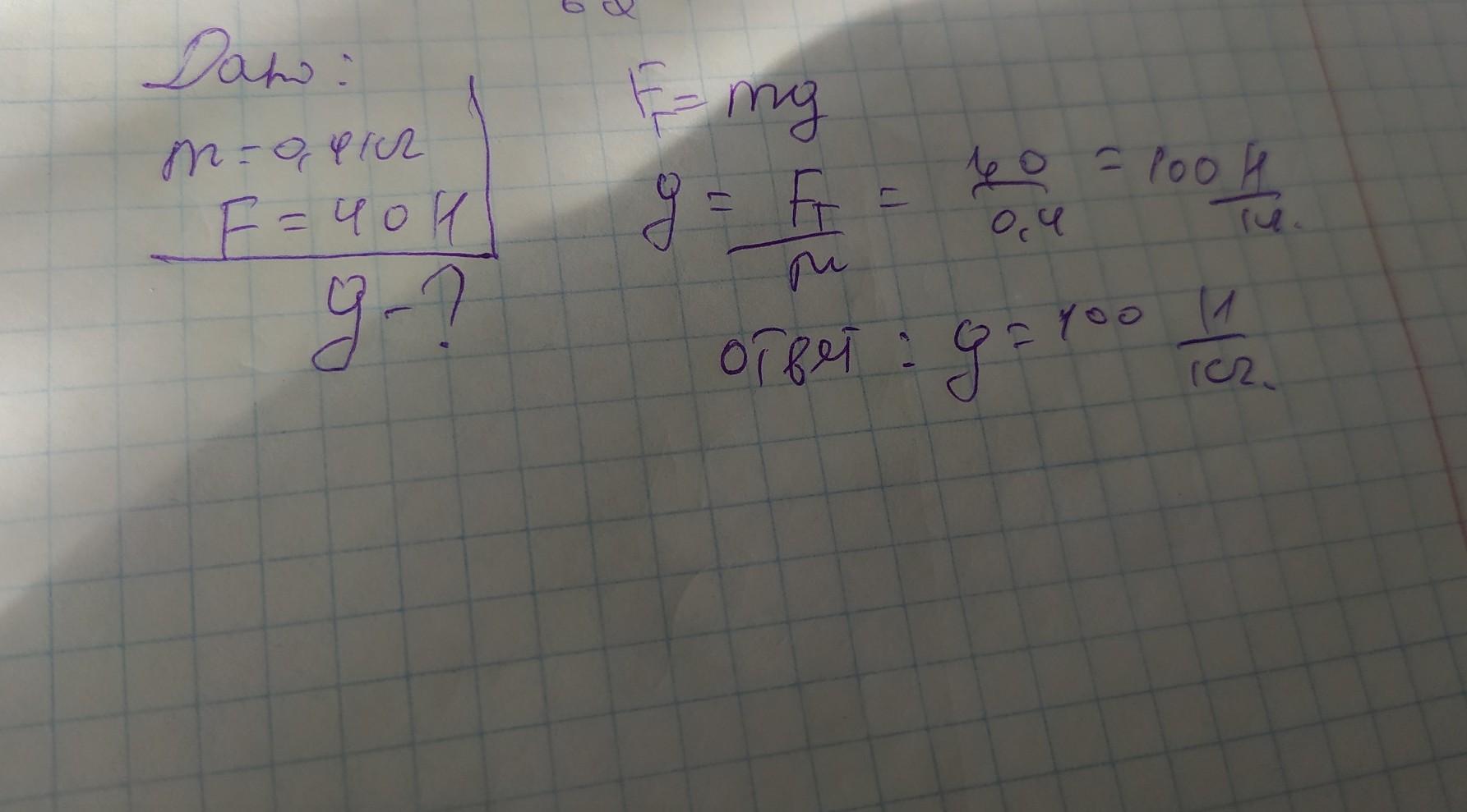 (физика 7 класс) Марату приснился сон, в котором он был космонавтом и оказался на другой планете. Марату снилось, что на привезённый с Земли динамометр он подвесил груз массой 0,4 кг. При этом динамометр показал значение силы тяжести 40 Н. Чему равно ускорение свободного падения на этой планете? Ответ дайте в Н/кг.