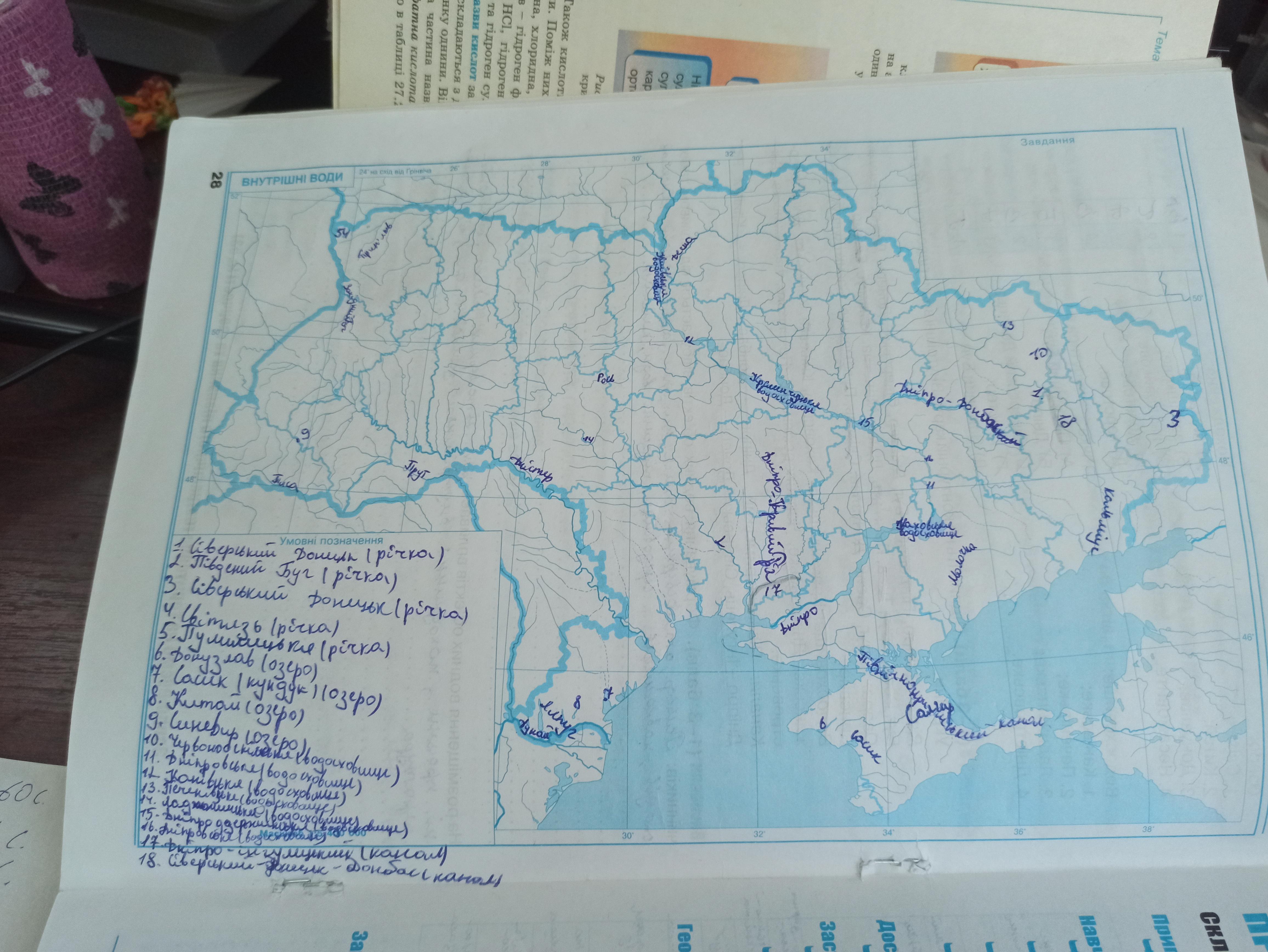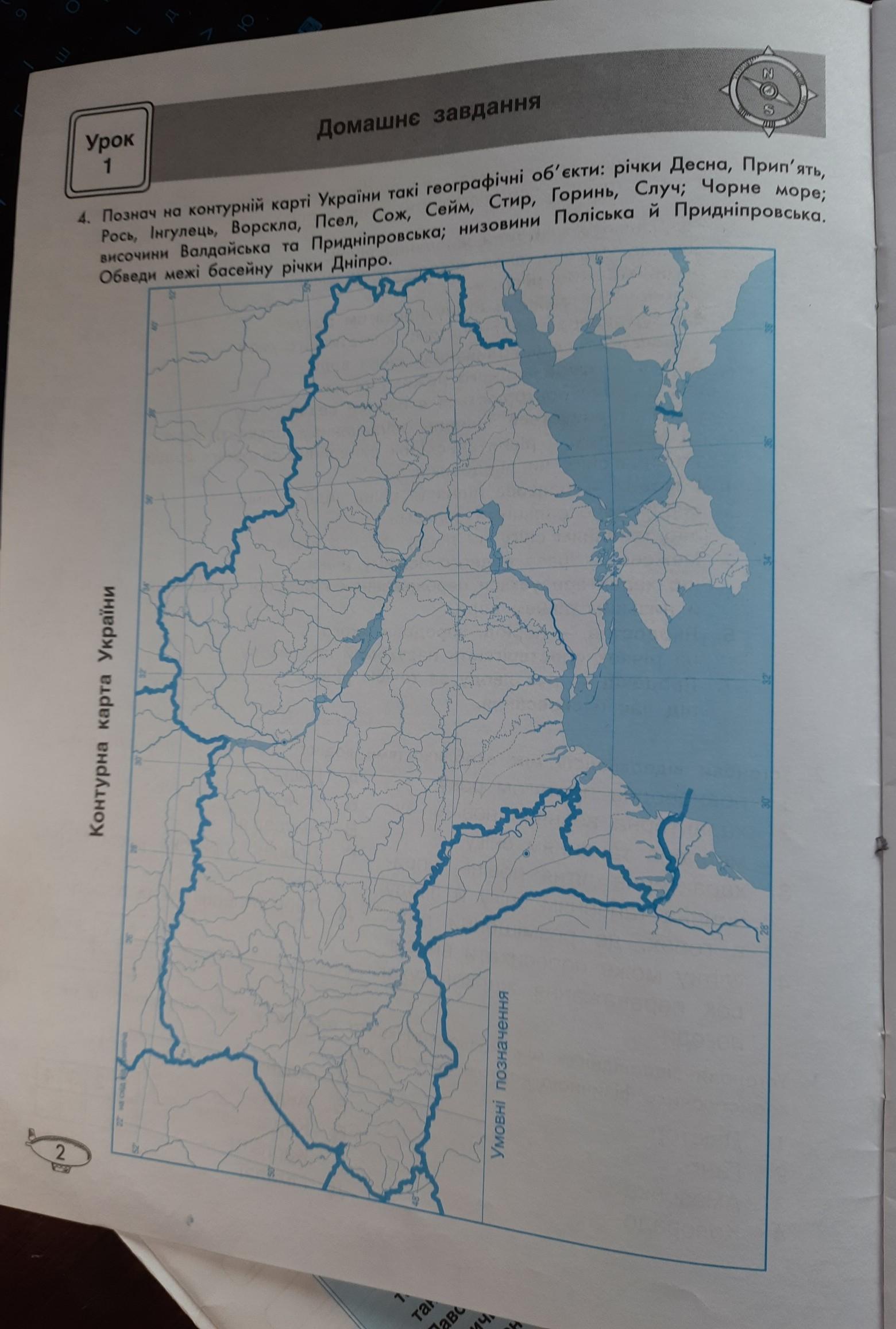 4. Познач на контурній карті України такі географічні об'єкти: річки Десна, Прип'ять, Рось, Інгулець, Ворскла, Псел, Сож, Сейм, Стир, Горинь, Случ; Чорне море; височини Валдайська та Придніпровська; низовини Поліська й Придніпровська. Обведи межі басейну річки Дніпро.