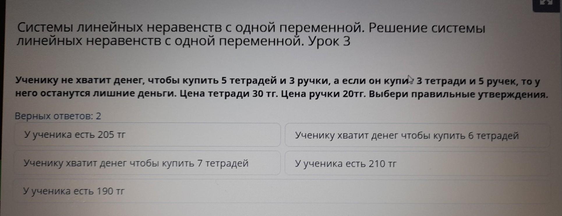 Если ученику хватает купить 3 тетради и 5 ручек, то у него точно будет 190 тенге т. к.