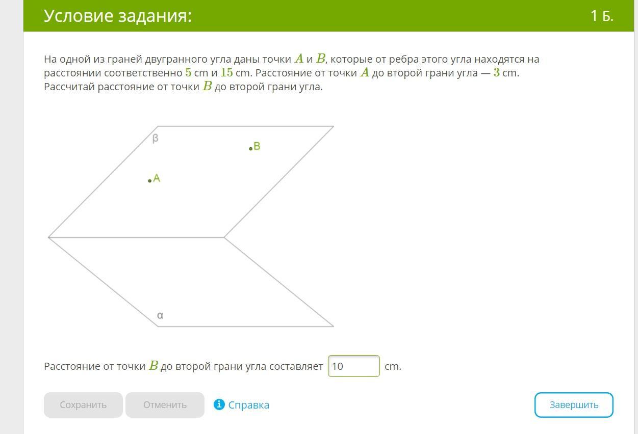Здесь подобные прямоугольные треугольники с гипотенузами 5 и 15 см. Высоты также подобны, поэтому расстояние от точки B до грани будет равно: