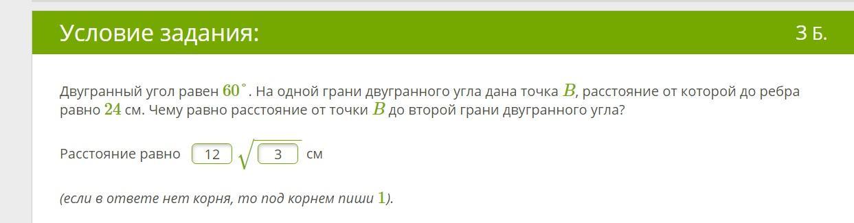 Расстояние до грани - это высота, вместе с углом образует прямоугольный треугольник с гипотенузой равной расстоянию до ребра =24 см. Высота - это катет, который является противолежащим углу в 60°.