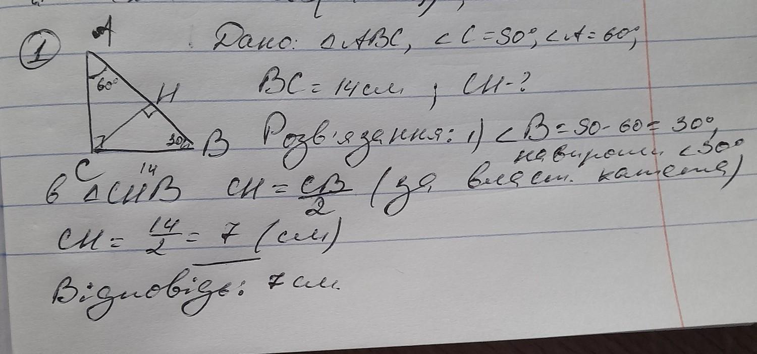 катет, протилежний куту 60 градусів, дорівнює 14 см. Знайдіть висоту трикутника,проведену до гіпотенузи