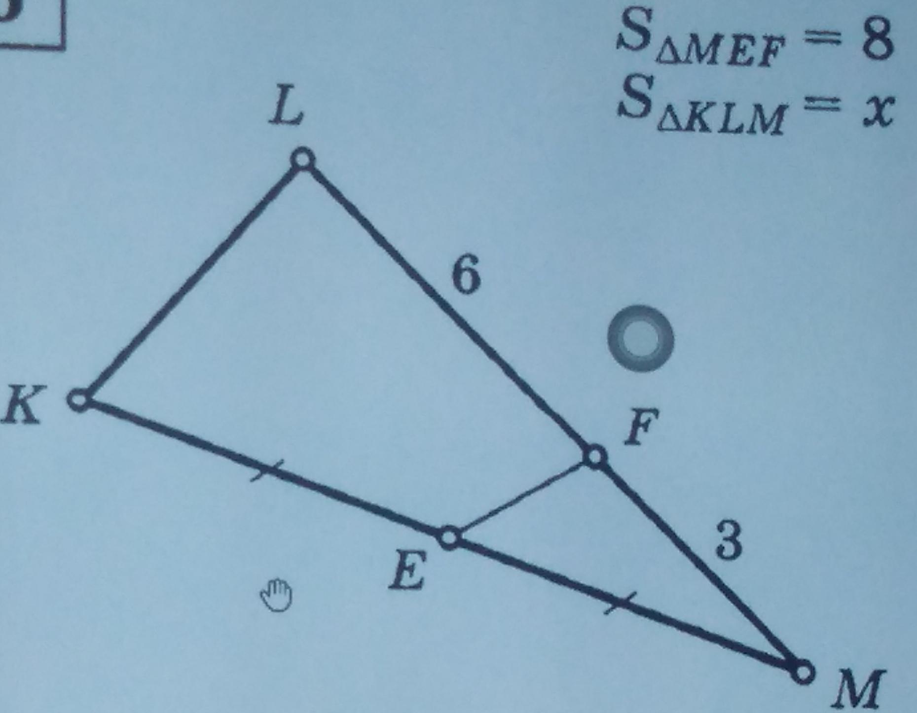 S(KLM)=1/2 ML*KM*sinM, S(MEF)=1/2 EM*MF*sinM, Заменим KM на
