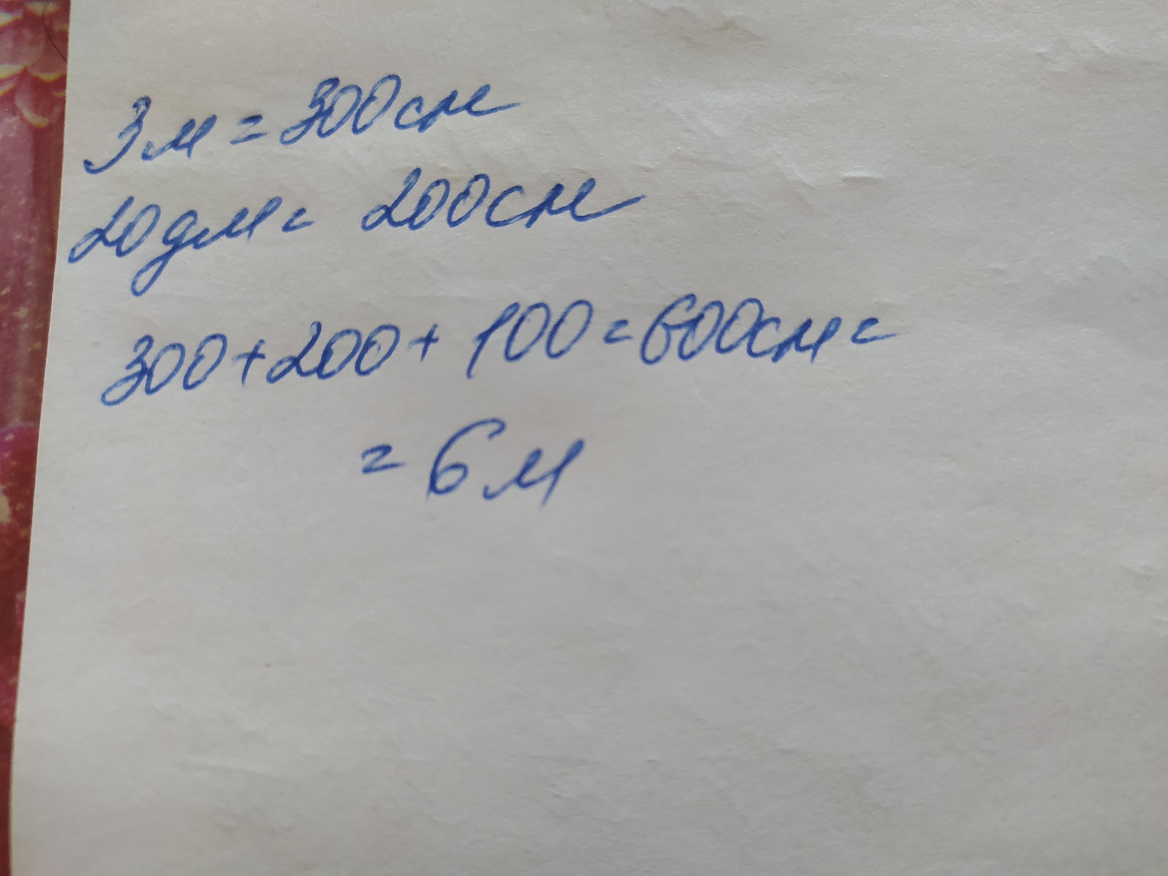 Трое рабочих рыли траншею.Первый рабочий выкопал 3м траншеи второй рабочий - 20 дм, а третий рабочий -100 см. Какова длина траншеи?
