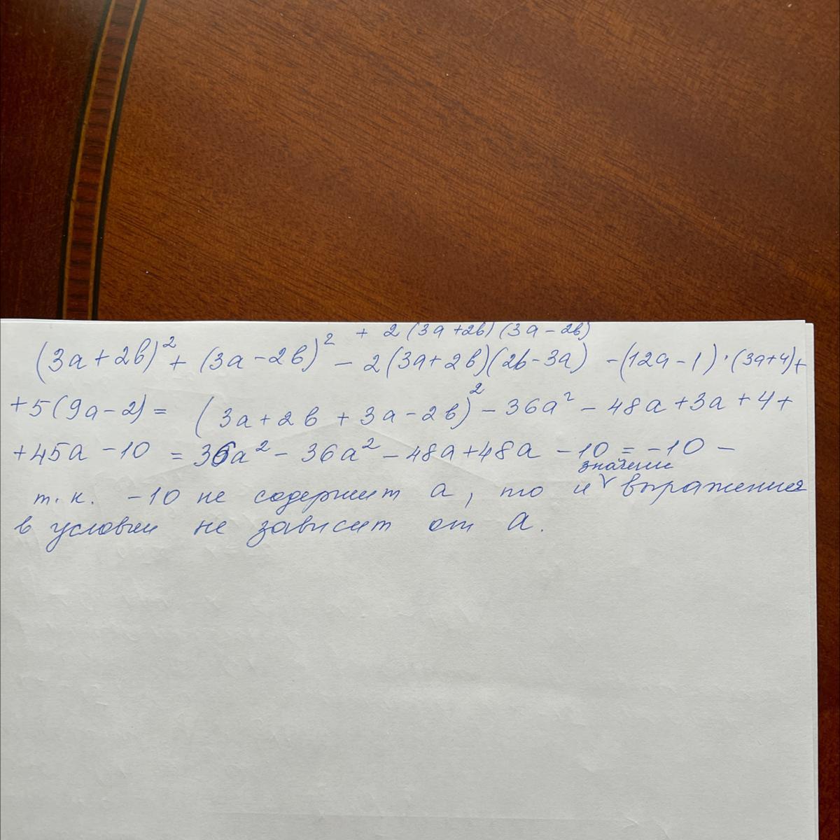 (3а+2b)² + (3a-2b)² - 2 (3a+2b)(2b-3a) - (12a-1)(3a+4)+5(9a-2)