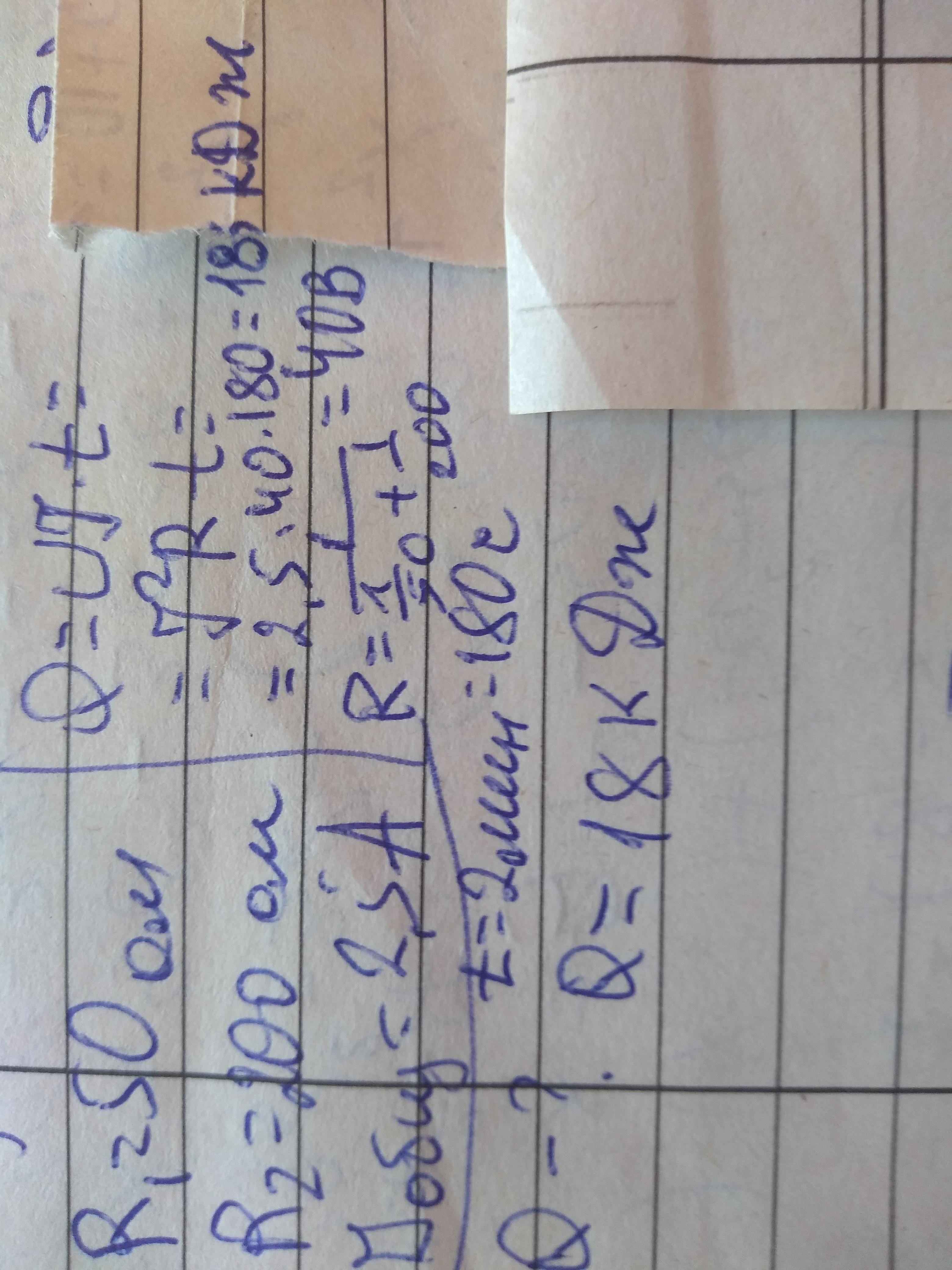 Два проводника сопротивлением 50 Ом и 200 Ом соединены параллельно. Ток в проводящих проводах 2,5 А. Какое количество теплоты выделяется в каждом проводнике за 2 мин?