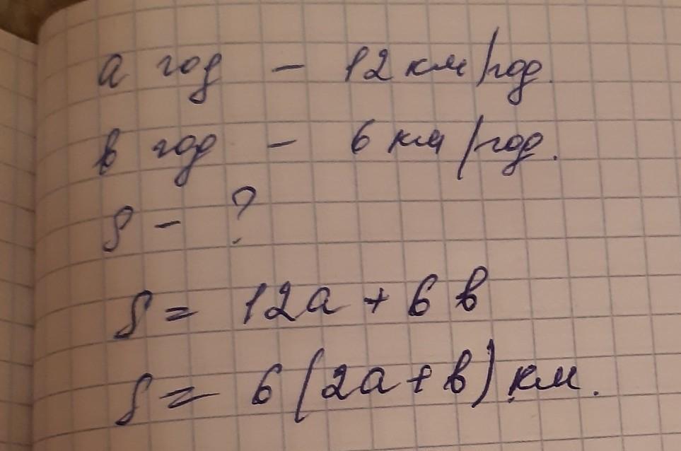 Турист їхав на велосипеді a год зі швидкістю 12км/год і плив на човні b год зі швидкістю 6 км/год скільки всього кілометрів подолав турист??? пожалуйста помогите дам 10 балов (можно подписать на действия?)