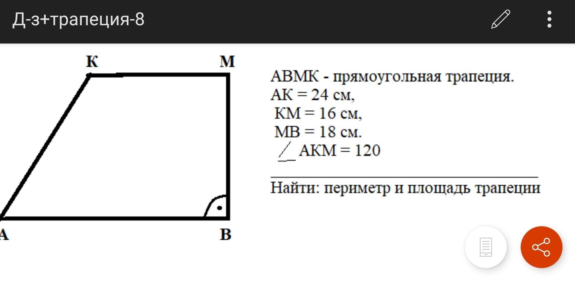 в 30 гр.), тогда АВ=12+16=28, Р=24+16+18+28=86, S=(KM+AB)/2 *MB=
