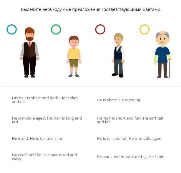 1) He is tall and fat. His hair is red and wavy