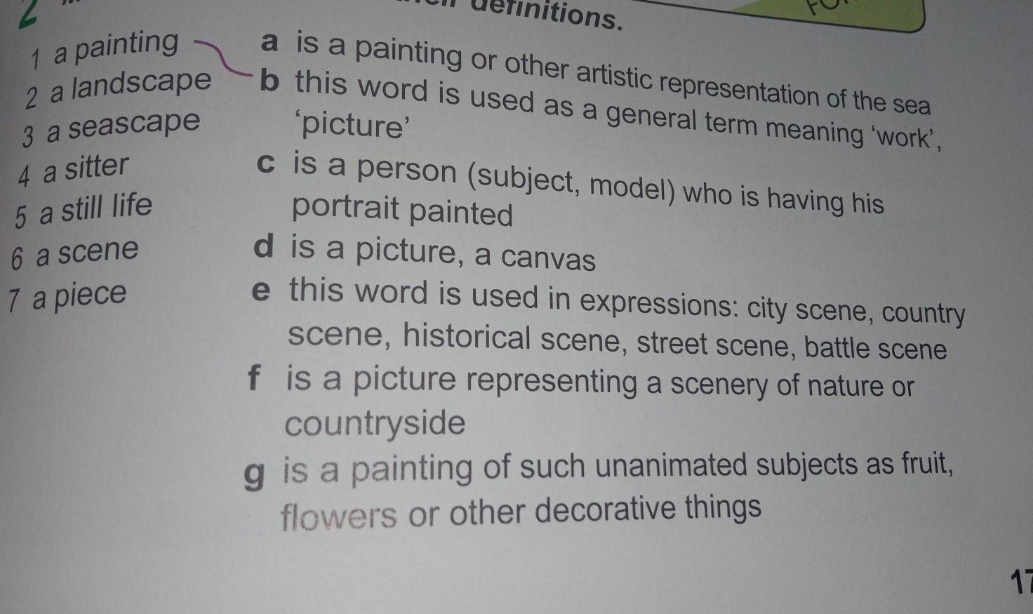 5) a still life — g) is a painting of such unanimated subjects as fruit, flowers or other decorative things