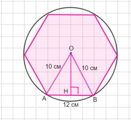 Пусть дан шестиугольник , вписанный в окружность радиуса 10 см. Стороны шестиугольника равны 12 см.