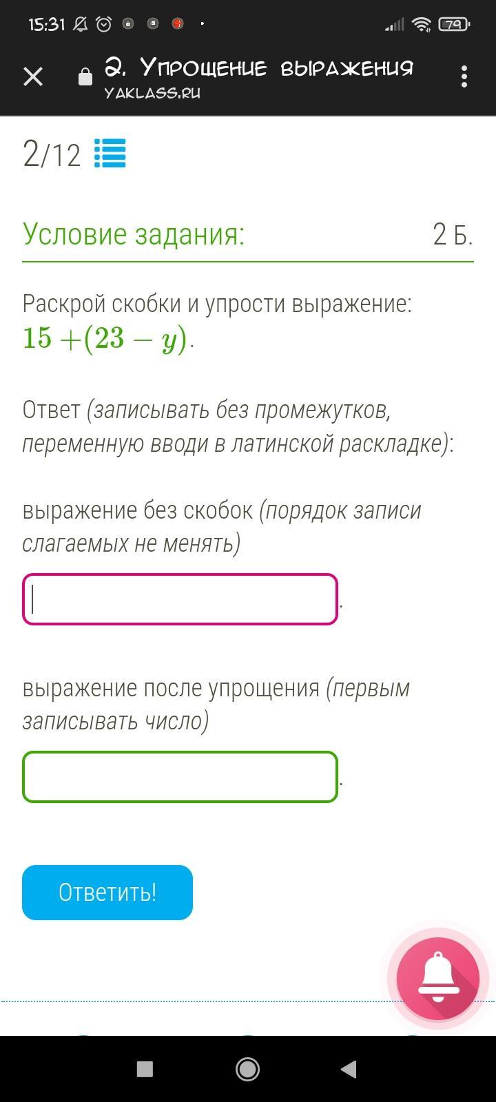 в фиолетовой строке :15+23-y