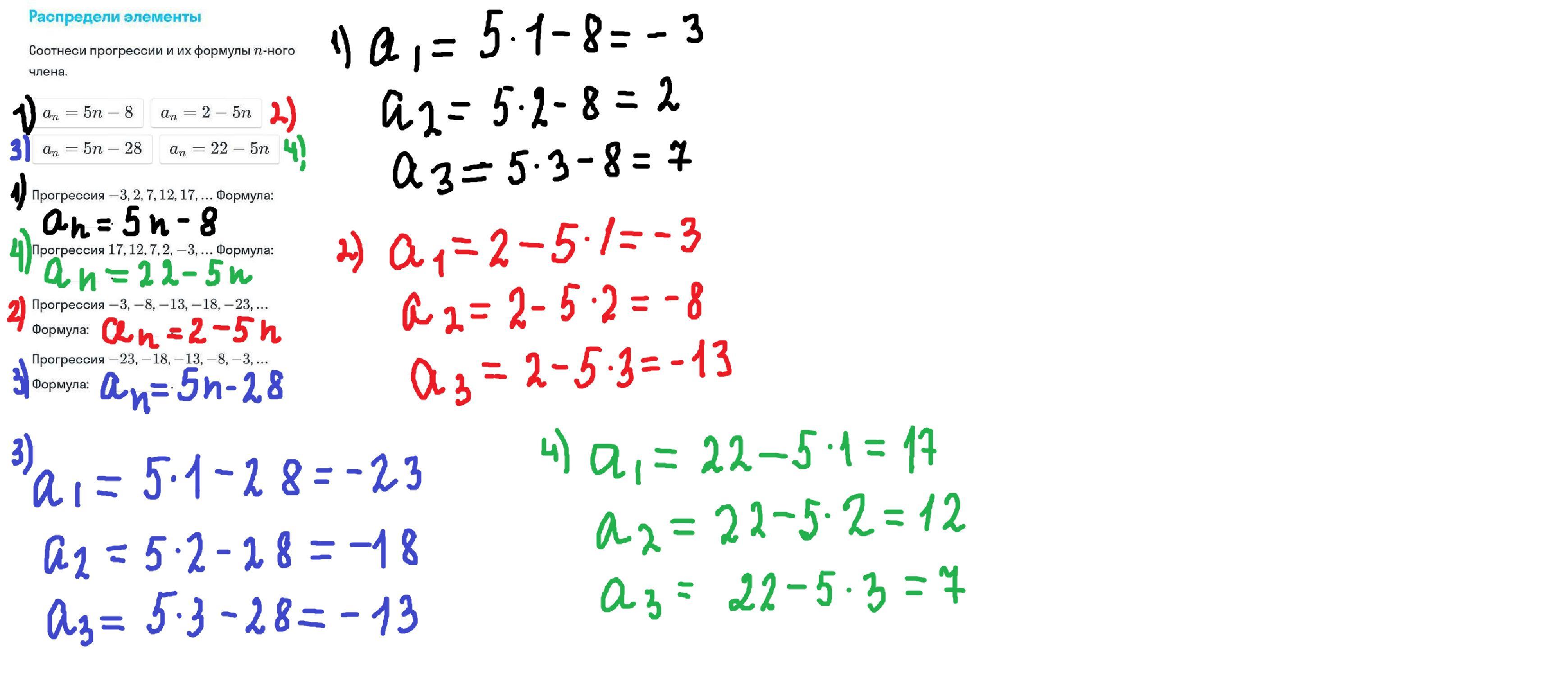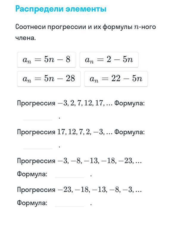 будем подставлять в формулу вместо n число 1,2,3 и потом увидим,какой формуле какакя прогрессия соответствует.