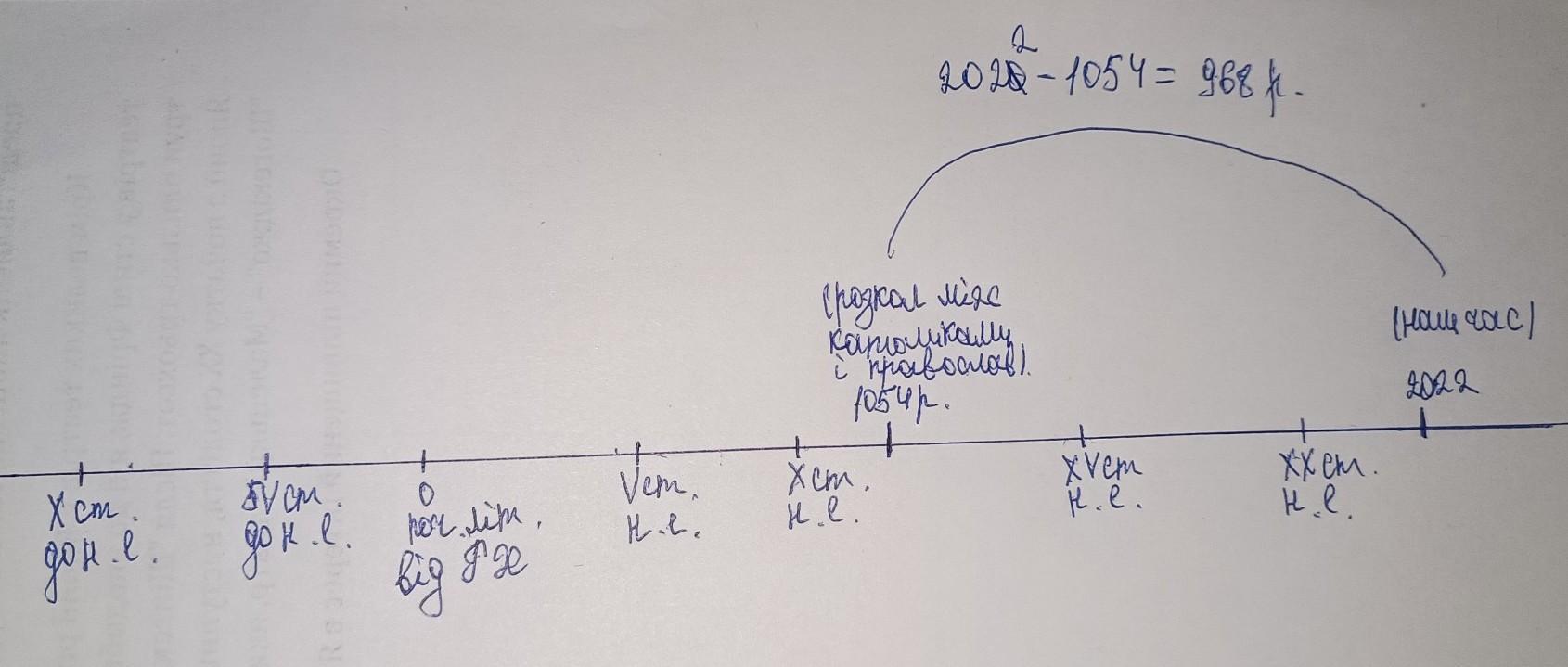 Розв'яжіть історичну задачу і нанесіть вiдповiднi роки на стрічку часу. Обчисліть, скільки вiддiляє церковний озкол мiж католиками та православними від Схизми.
