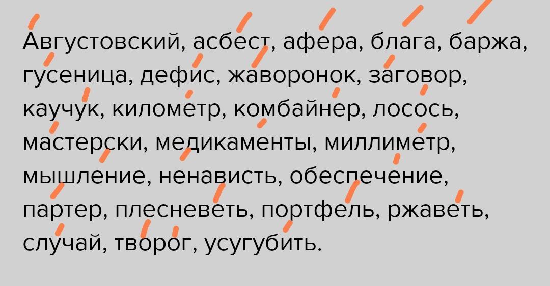 Августовский, асбест, афера, блага, баржа, гусеница, дефис, жаворонок, заговор, каучук, километр, комбайнер, лосось, мастерски, медикаменты, миллиметр, мышление, ненависть, обеспечение, партер, плесневеть, портфель, ржаветь, случай, творог, усугубить.