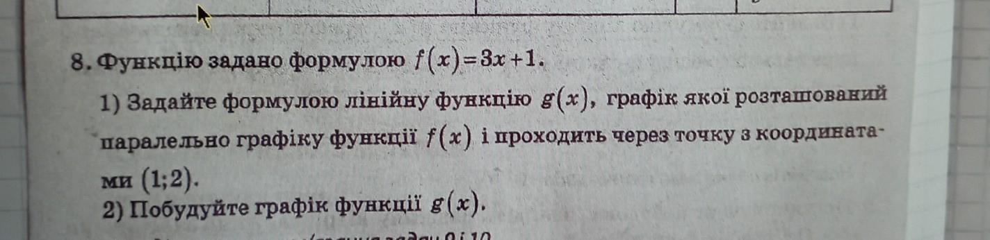 8. Функцію задано формулою f(x) = 3x +1. 1) Задайте формулою лінійну функцію g(x), графік якої розташований паралельно графіку функції f(x) і проходить через точку з координатами (1;2). 2) Побудуйте графік функції g(x). (фото)