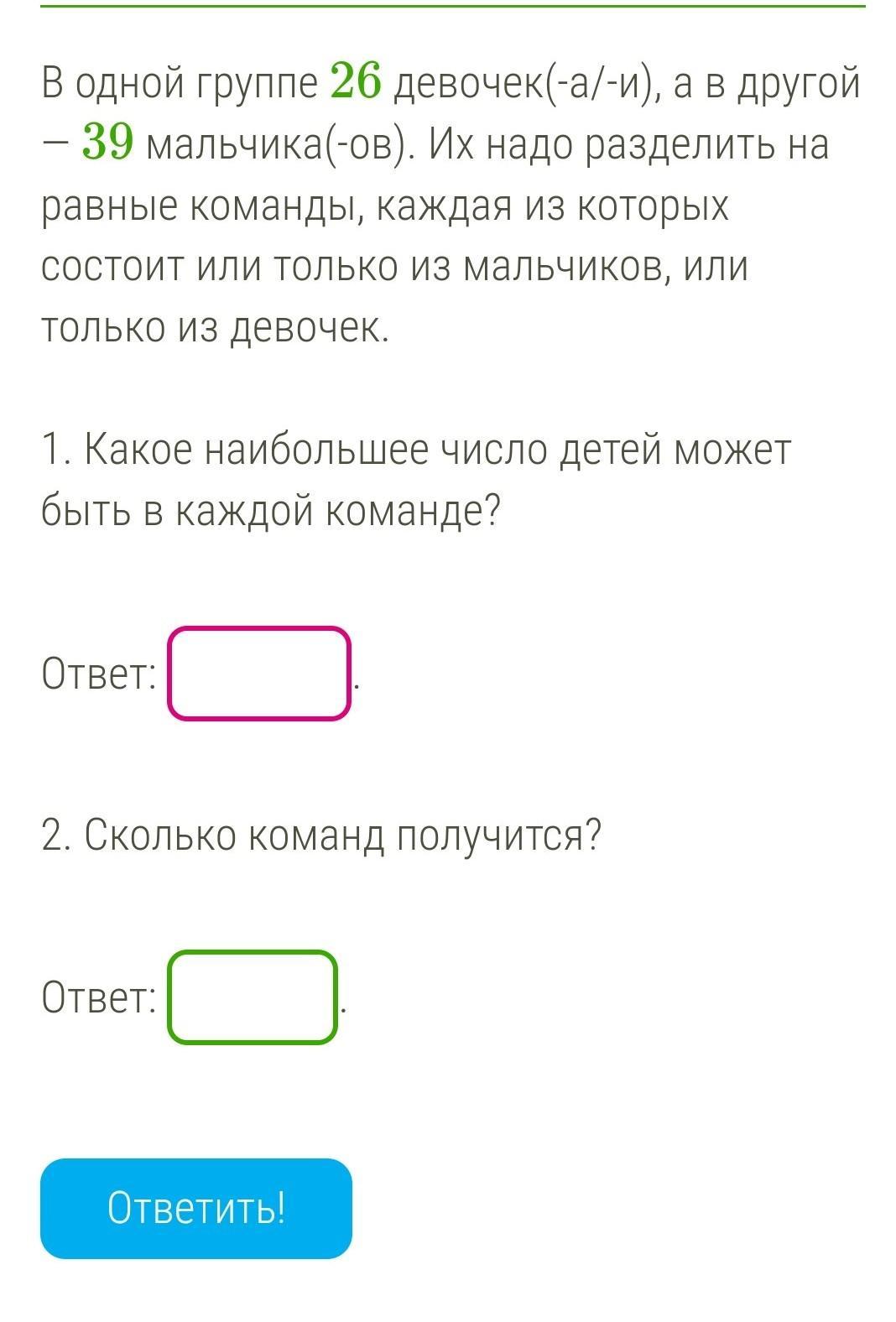 количество детей в команде подбирается , как наибольший общий делитель у чисел 26 и 39 . Это число 13 .