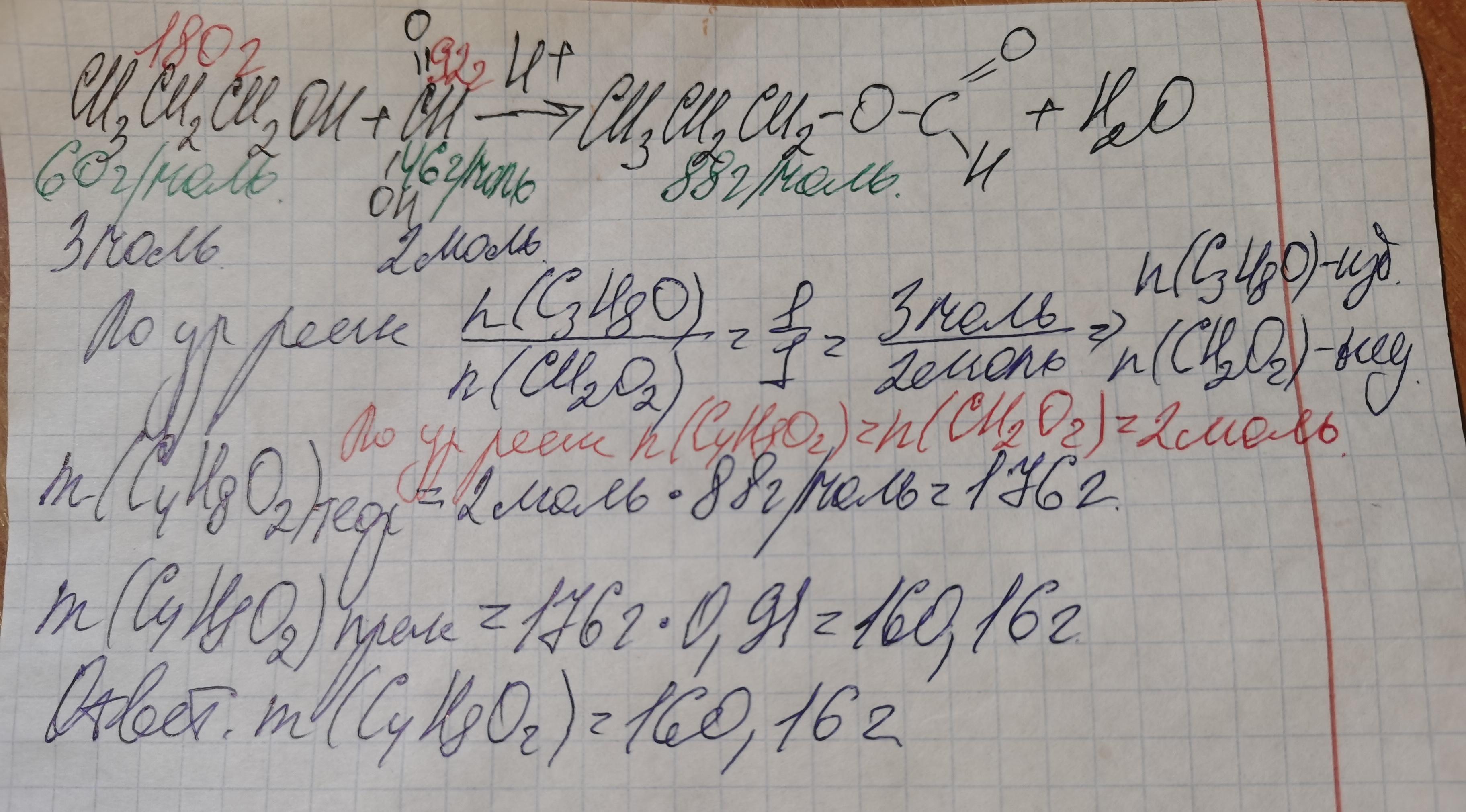 Какая масса эфира образуется при нагревании 180 грамм пропанола и 92 грамма муравьиной кислоты, если выход эфира от теоретически возможного составляет 91 %.