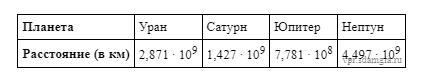 В таблице приведены расстояния от Солнца до четырёх планет Солнечной системы. Какая из этих планет дальше всех от Солнца?