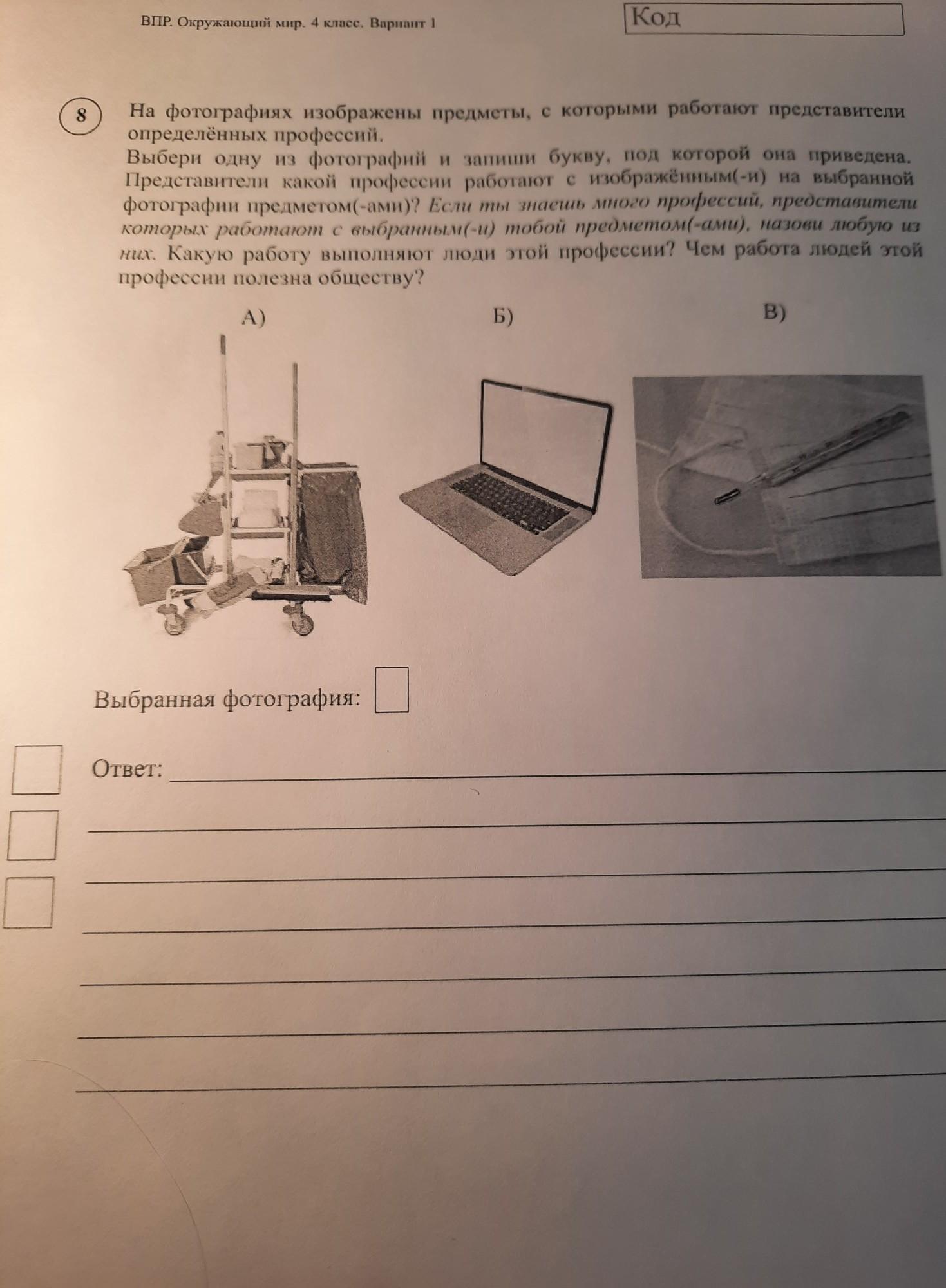 S На фотографиях изображены предметы, с которыми работают представители определённых профессий. Выбери одну из фотографий и запиши букву, под которой она приведена. Представители какой профессии работают с изображённым(-и) на выбранной фотографии предметом(-ами)? Если ты знаешь много профессий, представители которых работают с выбранным(-и) тобой предметом(-ами), назови любую из них. Какую работу выполняют люди этой профессии? Чем работа людей этой профессии полезна обществу? А) Б) B) CAN