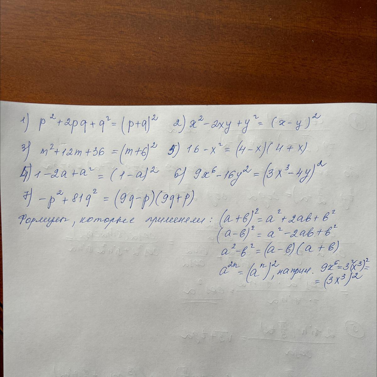 разложите на множители 1) p²+2pq+q² 2) x²-2xy+y² 3) m²+12m+36 4) 1-2a+a² 5) 16-x² 6) e²-25 6) 9x^6-16y² 8) -p²+81q² срочно пж