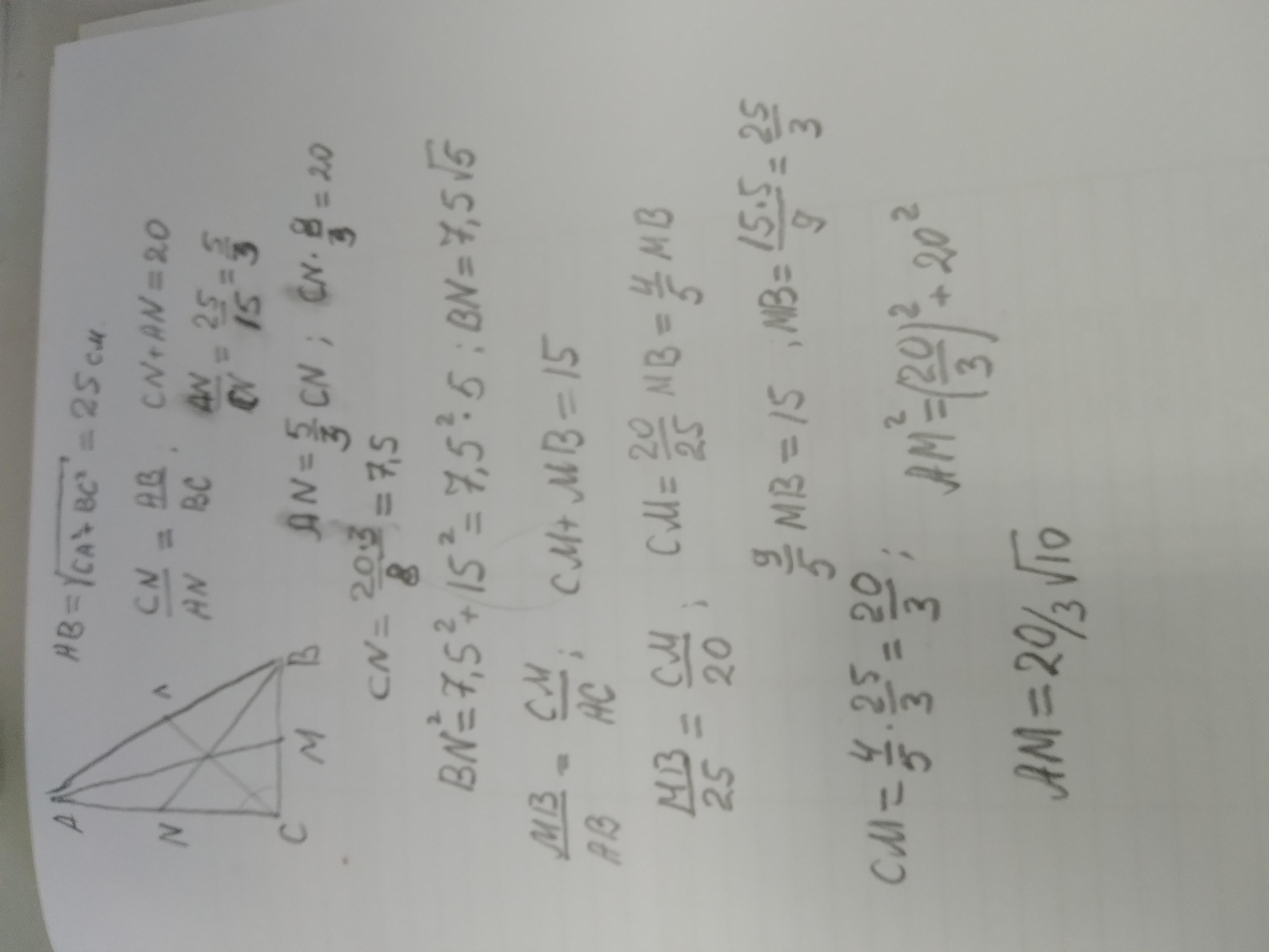 В прямоугольном треугольнике ABC, AM и BN являются биссек. трисами. Найдите длины этих биссектрис, если AC=20 см, СВ- =15 см
