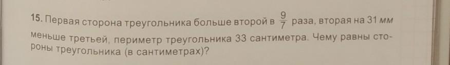 Пусть вторая сторона треугольника равна х см, тогда первая сторона равна 9/7х см, а третья сторона равна (х + 3,1) см.. По условию задачи известно, что периметр треугольника равен или 33 см. Составим уравнение и решим его:
