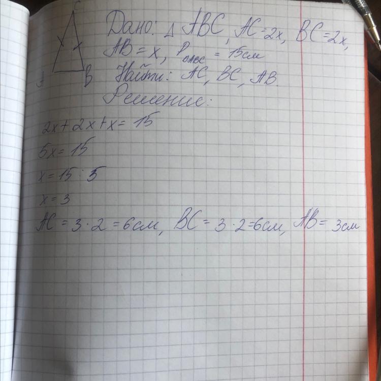 В равнобедренном треугольнике боковая сторона 2 раза больше основания. Найдите стороны треугольника, если периметр равен 15 см. с оформлением и рисунко и ответ хороший дайте плиз