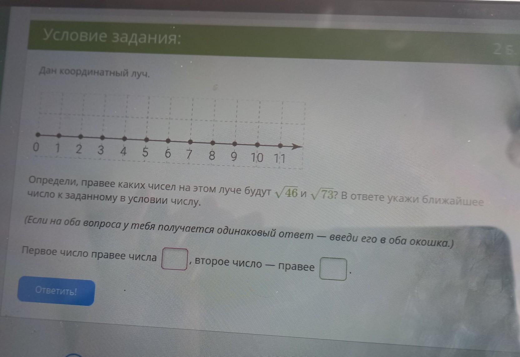 определи, правее каких чисел на этом луче будут корень из 46 и корень из 73.В ответе укажи ближайшие число к заданному в условии числу.
