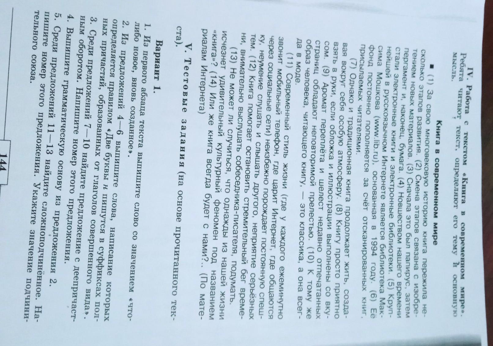 Вариант 1. 1. Из первого абзаца текста выпишите слово со значением «что-либо новое, вновь созданное». 2. Из предложений 4—6 выпишите слова, написание которых определяется правилом «Две буквы н пишутся в суффиксах полных причастий, образованных от глаголов совершенного вида». 3. Среди предложений 7—10 найдите предложение с деепричастным оборотом. Напишите номер этого предложения. 4. Выпишите грамматическую основу из предложения 2. 5. Среди предложений 11—13 найдите сложноподчинённое. Напишите номер этого предложения. Укажите значение подчинительного союза.