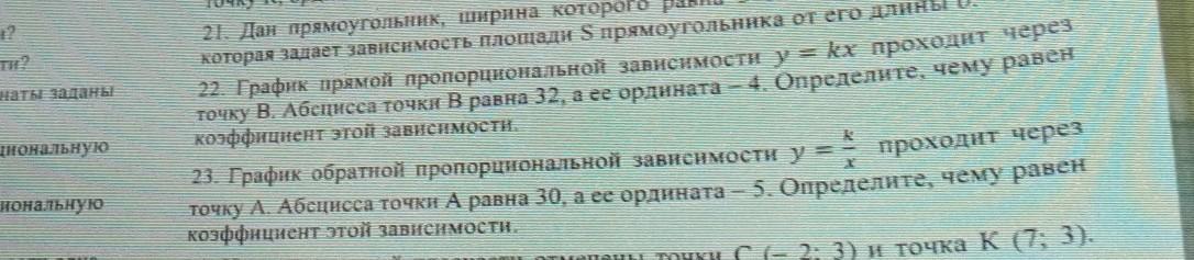 \displaystyle\bf\\22)\\\\y=kx\\\\B(32 \ ; \ -4) \  \ \Rightarrow \  \ x=32 \  \ ; \  \ y=-4\\\\-4=k\cdot 32\\\\k=-4:32\\\\\boxed{k=-0,125}\\\\\\23)\\\\y=\frac{k}{x} \\\\A(30 \ ; \ -5) \  \ \Rightarrow \  \ x=30 \  \ , \  \ y=-5\\\\\\-5=\frac{k}{30} \\\\k=-5\cdot 30\\\\\boxed{k=-150}