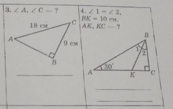 3. Угол А =30°,тк катет(ВС) лежащий напротив угла в 30° равен половине гипотенузы(АС)
