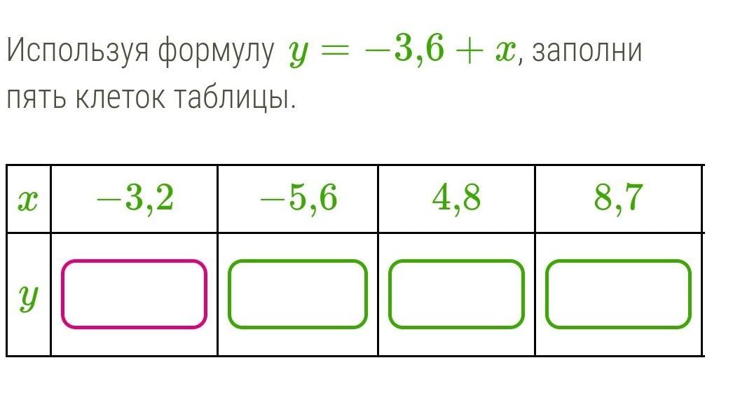 Используя формулу y = -3,6 + x, заполни пять клеток таблицы.